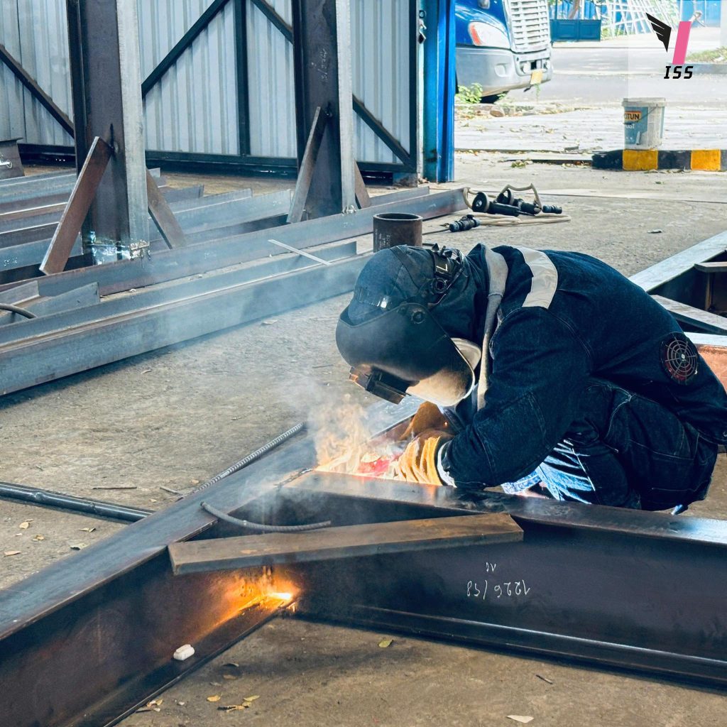 Welding works utilize MIG CO₂ welding and manual arc welding, requiring skilled welders to produce uniform weld beads with proper penetration, minimizing deformation and ensuring strong and reliable structural connections.